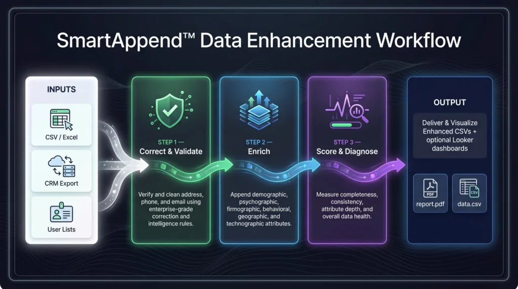 SmartAppend™ is a next-generation data enhancement and enrichment system that transforms raw customer files into complete, accurate, and insight-rich profiles. Our process standardizes, validates, and cleans your data, then enriches each record with powerful demographic, psychographic, behavioral, technographic, geographic, and firmographic attributes. The result is a customer dataset that’s cleaner, smarter, and far more actionable — enabling sharper targeting, stronger segmentation, and better marketing ROI.